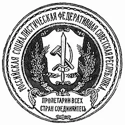 The acronym shown above the hammer and sickle reads PCФCP, for Российская Советская Федеративная Социалистическая Республика.
