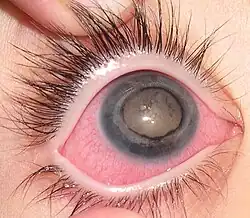 | Clinical photography of patient with Coats' disease, showing conjunctival hyperemia, mild corneal edema, posterior synechiae and cataract | |