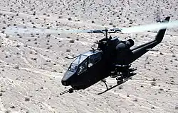Much of the Cobra's armaments could be installed upon the multiple hardpoints that were attached to the stub wings set on either side of the fuselage.[4][8] In comparison to armed UH-1s, the Cobra would typically have carried twice as much ammunition and arrive on station in half the time, it also had three times the loiter time, which enabled the type to arrive in a designated landing zone ahead of transport helicopters to clear it, provide support fire while they are present, and to continue fighting as they withdraw.[4] The slim profile of the helicopter allegedly provided defensive benefits by making it harder for opponents to accurately hit it with small arms fire, although man-portable air-defense system (MANPADS) did prove to be effective against the Cobra. Particularly vulnerable areas included the tail rotor drive shaft and the main transmission.[4]