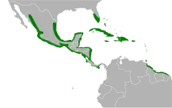 The mangrove cuckoo is a resident of southern Florida in the United States, the Caribbean, both coasts of Mexico and Central America, and the Atlantic coast of South America as far south as the mouth of the Amazon River. It is found primarily in mangrove swamps and hammocks.[9] The mangrove cuckoo is generally fairly common in its specialized range. This bird could be threatened by human development of mangrove habitat.