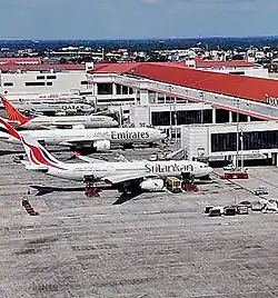 Work on the third phase was intended to accommodate 5 million passenger movements annually and was started in 2007.[21] The third phase involved the commissioning of a central block, connecting the domestic and international terminals and enlarging the airside area to accommodate more gates and waiting areas along with increased shopping areas. This increased the built-up area by another 29,700 m2 (320,000 sq ft).[22] The airside area of the international arrivals and departures blocks were integrated and glass walls were installed to allow for more natural light. The runway was re-surfaced in 2008.[23] The number of parking areas was increased from 15 to 24, including three dedicated for cargo airlines. The third phase also completed the expansion of the cargo village and a second aircraft taxiway to the MRO facility.[24][25]