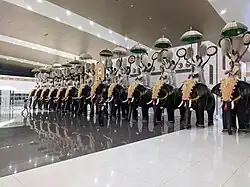 The new international Terminal 3 was opened to travellers in March 2017. The theme of the terminal is inspired by Thrissur Pooram and is built in traditional Kerala architecture. 15 real-size fibre elephants, adorning traditional costumes welcome the travellers at the departure facility area. The terminal has 5 entry gates, 84 check-in counters and 80 immigration counters. It is equipped with 10 escalators, 21 elevators, and 3 moving walkways.[43] The terminal has a solar carport facility with a capacity of generating 2.7 MW power and can provide a parking facility for 1,400 cars. Along with the solar carport at the domestic Terminal 1, it is the largest solar carport in the world with a total capacity of 5.1 MW of power and a parking facility for 2,800 cars.[41]