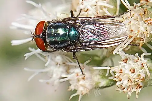 Cochliomyia macellaria, also known as the secondary screwworm, is a species of blow fly in the family Calliphoridae.[1][3][4] These screwworms are referred to as "secondary" because they typically infest wounds after invasion by primary myiasis-causing flies.[1] While blow flies may be found in every terrestrial habitat, C. macellaria is primarily found in the United States, American tropics, and sometimes southern Canada.[5] They are most common in the southeastern United States in states like Florida. C. macellaria have a metallic greenish-blue thorax and a red-orange head and eyes.[6] These adult blowflies range from 5–8 mm in size.[6]