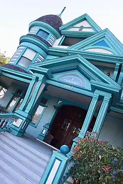 The Cockins House was designed and constructed in 1894 by James H. Bradbeer and Walter Ferris. It is 5,570 sq. ft. and built in the Queen Anne style.[1] It was created for William and Sarah Cockins who occupied the home until 1903.[2] Next, Thomas P. Newton resided at the house, staying until 1908. The house was converted to a duplex in 1911,[1] and it was rumored Charlie Chaplin stayed at the home in 1913,[3] alongside USC students. Over time, the structure fell into disrepair. Concerned neighbors nominated it for historic status; it became Los Angeles Historic-Cultural Monument No. 519 on Feb. 1, 1991.[1] The University of Southern California acquired the property and refurbished it, opening the Center for Occupation and Lifestyle Redesign in it in 1999.[1][3]