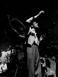 Although in 1938 Cocteau had compared Adolf Hitler to an evil demiurge who wished to perpetrate a Saint Bartholomew's Day massacre against Jews, his friend Arno Breker convinced him that Hitler was a pacifist and patron of the arts with France's best interests in mind.[15] During the Nazi occupation of France, he was in a "round-table" of French and German intellectuals who met at the Georges V Hotel in Paris, including Cocteau, the writers Ernst Jünger, Paul Morand and Henry Millon de Montherlant, the publisher Gaston Gallimard and the Nazi legal scholar Carl Schmitt.[17] In his diary, Cocteau accused France of disrespect towards Hitler and speculated on the Führer's sexuality. Cocteau effusively praised Breker's sculptures in an article entitled Salut à Breker published in 1942. This piece caused him to be arraigned on charges of collaboration after the war, though he was cleared of any wrongdoing and had used his contacts for his failed attempt to save friends such as Max Jacob.[18] Later, after growing closer with communists such as Louis Aragon, Cocteau would name Joseph Stalin as "the only great politician of the era".[19]