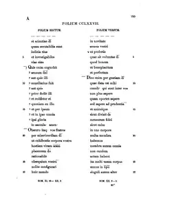 The text of the codex is not divided into chapters. The nomina sacra are used both in Gothic and Latin texts (ihm and ihu for "Iesum" and "Iesu"). All the abbreviations are marked with the superscript bar.[4][6] Its text has some value in Romans 14:14 for Textual Criticism.[7]