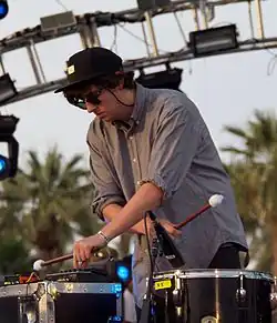 The songs are characterised by droning harmonies,[24] simple chord progression, keyboard ostinatos,[25] ringing guitar,[9] resounding reverb,[19] slight bass grooves, and programmed beats.[8] Sim plays counterpoint melodies on his bass,[26] while Croft plays angular figures,[27] sketchy musical patterns,[28] and melodies developed from two-note intervals; Price likens Croft's use of the guitar to playing a harp.[20] Smith's production is largely responsible for the music's lowest frequency sounds and incorporates both four on the floor and 2-step beats,[7][16] subtle BPM changes,[8] heartbeat-like drum machine rhythms,[29] strings, and live percussion such as timpani, snare drums, and steelpans.[21] The latter instrument is played in arpeggio and exhibits Jamaican music influences.[9] Critic Will Hermes views Smith as a more prominent contributor on Coexist than on the debut album and comments that "the beats and musical backdrops are more varied and command more attention."[30]