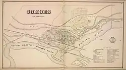 In 1831, a new Cohoes Company constructed a dam on the Mohawk River above the city's waterfall in order to better regulate water flow for industrial use. It was soon swept away by ice at the break-up in spring, and a new dam was built the following year. Two canals extended from the dam to provide water power for industry.[4] Ironworks were the first main industry in Cohoes, as it was in Troy, Menands, and West Troy. Daniel Simmons' Simmons Axe Company was famous throughout the United States, and the Cohoes Iron Foundry was a large business enterprise in the 1830s.[6]