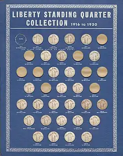 It consists of a strip of cardboard, typically measuring 11 inches wide by 14 inches tall, with holes punched into it the size of the particular coins. A face paper having the same hole pattern carries the appropriate text and graphics. This typically consists of dates and mintmarks printed beneath each opening, sometimes with the addition of the number of pieces coined for that issue. A bold title for the coin series will appear at the top of the board, and the bottom of the face will have publication and copyright information. On some coin boards the bottom of the face will also provide some historical and technical information about the coin series, as well as misguided instructions for cleaning coins. On the most common coin boards, those published by Whitman, this information was later moved to the back of the board, and this is more typical for other publishers, too.[1]