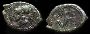 The obverse of the Cales didrachm features the bejeweled head of Athena, with Corinthian helmet adorned with feathers. There may be various symbols: on the helmet, behind the head. Sometimes there are letters under the neck in the Greek alphabet.[35] The type with the head of Athena is widely used in the coinage of the Greek world, such as in the coins of Athens and Corinth.[36][37]
