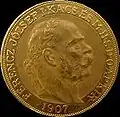 100 K | 37.0 mm | 2.0 mm | 33.9 g | 900‰ gold | "BIZALMAM AZ ŐSI ERÉNYBEN", ornament | "FERENCZ JÓZSEF I.K.A.CS. ÉS M.H.S.D.O.AP.KIR.", I. Ferenc József | "MEGKORONÁZTATÁSÁNAK NEGYVENEDIK ÉVFORDULÓJÁRA 1867-1907", coronation scene, value, mintmark | 1907 |