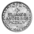 Beginning in 1936, the federal mint issued commemorative coins at irregular intervals. The 1936 issue commemorated the national war bond (Wehranleihe). Further commemorative 5 francs coins in silver were issued in 1939 (Battle of Laupen), 1941 (Rütli oath, 650th anniversary of the Federal Charter), 1944 (Battle of St. Jakob an der Birs), 1948 (Swiss Federal Constitution, 100th anniversary) and 1963 (Red Cross, 100th anniversary). These were legal tender at the time, but were removed from circulation along with the regular silver coins in 1971.[18]