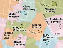 - ^ Historical Gazetteer of London before the Great Fire; 1, Cheapside: Parishes of All Hallows Honey Lane, St. Martin Pomary, St. Mary le Bow, St. Mary Colechurch, and St. Pancras Soper Lane; Keene, D & Harding, V. Cambridge: Chadwyck-Healey, 1987 ISBN 0859641902
