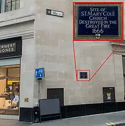 St Mary Colechurch was a parish church in the City of London. It was destroyed in the Great Fire of London in 1666 and not rebuilt.[1]