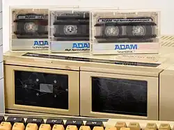 A unique feature of the Adam was its use of modified cassette tapes for storage, the "Digital Data Pack" (DDP). In contrast to the many similar systems used on other computers of the era, which used unmodified tape mechanisms, the DDP system used a custom mechanism that ran the tape over ten times as fast, 20 inches (51 cm) per second rather than a normal cassette's 1.875 inches (4.76 cm) per second.[40] This allowed it to transfer data more rapidly, closing the gap between the inexpensive but slow cassettes and the faster but more expensive floppy disk systems. The practical data rate was around 1.4 kbytes per second,[40] in contrast to cassette formats of the era which were mostly between 300 and 1,200 bits per second, or a floppy disk like the Disk II at around 13 kbytes per second.