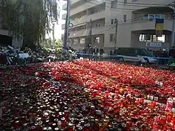Many artists canceled their concerts out of respect for the fire victims, including Delia, byron, and Luna Amară.[101] On 1 November, 12,000 people gathered in Bucharest in a march of solidarity.[102] Another 2,000 people gathered in front of the club to lay flowers and light candles.[103] Similar commemorations took place in major cities across the country. Churches in the country held memorials for victims of the fire.[104] In a national telethon organized by Intact Media Group, €1 million[105] was raised in donations from viewers and companies, including Carrefour, Coca-Cola HBC AG and Rompetrol.[106] Another fundraising campaign (Nouă ne pasă – "We Care") was organized by the Romanian Red Cross together with Pro TV and Vodafone Romania.[107] On 4 November, more than 20 Romanian artists organized a charity concert, the profit being donated to victims of the Club Colectiv tragedy.[108] Some artists include Connect-R, Delia, Carla's Dreams, Marius Moga, Dan Bittman, Voltaj, Andreea Bănică, Alina Eremia and Lora.[109]
