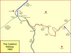 Coleford was an important location as a focal point for western access to the minerals of the Forest of Dean. However the construction of the Coleford Railway, from Monmouth, came late after a series of other initiatives.[1][2]