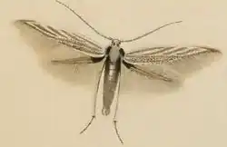 The larvae feed on Silene nutans, Silene otites, Silene italica, Arenaria grandiflora, Cerastium arvense and Lychnis viscaria. Silene nutans can sometimes be found in the UK National Vegetation Classification habitat communities: the very widespread MG1 (Arrhenatherum elatius grassland), and thus can be found where Arrhenatherum elatius, (also known as false oat grass), and/or Dactylis glomerata, (cock's-foot), occurs.[2] They create a trivalved, tubular silken case of about 12 mm (0.47 in) long. The case is yellowish white, with several characteristic dark length lines. The mouth angle is about 40°.[3]