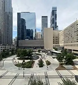 Originally, the park's official name was Barbara Ann Scott Park, named after 1948 Olympic champion figure skater Barbara Ann Scott. But, informally, the greenspace was commonly referred to as College Park,[10] a habit carried over in marketing the newer Aura condominium complex (at Yonge and Gerrard streets, north-west corner) as "Aura at College Park".[13] Prior to its closure for renovation in 2016,[11] the park had a skating pavilion standing by the Barbara Anne Scott rink.[10] The renovation was financed by $3 million in development fees from the Aura's builder,[10] plus additional funds from the City and the Downtown Yonge Business Improvement Area.[12] The architects were RAW Design and MBTW Group/Watchorn Architect.[11]