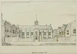 Alleyn drew upon the experience of other similar establishments in order to formulate the statutes and ordinances of the college (including borrowing the statutes of the already ancient Winchester College and visiting the more contemporary establishments of Sutton's Hospital (now Charterhouse School) and Croydon's Hospital (now Whitgift School)).[13] Amongst the many statutes and ordinances signed by Alleyn that pertained to the charitable scheme were provisions that the scholars were entitled to stay until they were eighteen. And to be taught in good and sound learning'…'that they might be prepared for university or for good and sweet trades and occupations.[14] Another stipulation was that the Master and Warden should always be unmarried and of Alleyn's blood, and surname, and if the former was impossible then at least of Alleyn's surname.[15] Alleyn also made provision that the people of Dulwich should be able to have their men children instructed at the school for a fee as well as children from outside Dulwich for a separate fee.[15]