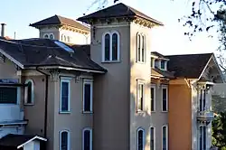 The Notre Dame de Namur University campus developed around Ralston Hall Mansion. William Chapman Ralston built Ralston Hall shortly after purchasing the property in 1864.[18] William Ralston was a pivotal figure in the gold and silver bonanzas, which helped Ralston amass wealth. Ralston Hall was built with a steamboat gothic design on the interior, which is rumored to have been influenced by Ralston's love of boating from a young age.[19] The interior of Ralston Hall is strikingly shaped like the inside of a boat.[19] Ralston Hall was built as an entertainment destination.[19] After William Ralston died, his business partner, William Sharon, came to control the mansion.[19] Sharon was a United States senator representing Nevada from 1875 to 1881.[19] Ralston Hall has been used for a variety of jobs throughout its history; Ralston Hall held one of the largest American weddings when William Sharon's daughter Flora married Sir Thomas Fermor-Hesketh of England.[19] The mansion was a finishing school for young women until 1898.[20] Since 1923 Ralston Hall has been affiliated with Notre Dame de Namur University.[20]