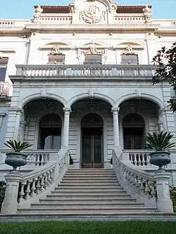 Although its date of construction is unclear, there was a petition to the local government on 9 April 1895, by the builder João Gomes da Silva Guerra.[1] The councilman Boaventura Rodrigues de Sousa, proprietary owner of the land on Avenida da Boavista (referred to on 9 April) and may have been the reason for the monogram inscribed on the cornices.[1] The building and landscaping was attributed to Joel Pereira, owing to Boaventura Rodrigues de Sousa having many similar requirements for other buildings along the Praça Gomes Teixeira, including an example on the corner of Rua das Carmelitas of the same authorship whose used a monogram also inscribed with the owners acronyms.[1] From an inventory elaborated by the Repartição de Arborização e Jardinagem (Landscaping and Gardening division) of Porto the site was populated with Camélias japónicas (34), Palmeiras spp. (10), Rododendron (4), Liriodendron tulipífera (2), Tílias cordatas (2), Tílias argentea (6), Tílias tomentosas (2), Sequóia and Pitosporum.[1]