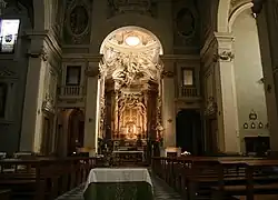 In the 13th century, the donations of various lords of the region led to the translation of the college of canons to the town. One partially legendary tradition is that in 1266, the Count Guido Guerra VI donated the putative relic of the Sacro Latte (holy breast milk of the Madonna). By 1283, the bas relief depicting the Martyrdom of St Lawrence had been completed.[1] Construction of the larger church was begun in 1327, with the main altar completed in 1360. This structure however was entirely changed with the Baroque refurbishment of the church at the start of the 18th-century architect Massimiliano Soldani Benzi, who was commissioned by his brother, Angiolo Domenico, who by 1706 was serving as provost of the Collegiata.