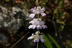 The inflorescence is an interrupted series of whorls of flowers. The flower is white to lavender to purple, sometimes bicolored, pouched and folded, with two toothed upper lobes and three notched lower lobes.