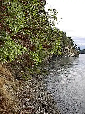 The vegetation is typical of south-facing slopes in the Coastal Douglas-fir zone, intergrading with Garry Oak and Arbutus. Western Red Cedar (Thuja plicata) is abundant in the areas shaded by cliffs, and grassland is present in coastal areas. The grasslands and open woodlands have an abundance of wildflowers typical of this zone, notably fairy slipper (Calypso bulbosa) and Collinsia parviflora.