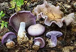 Collybia (in the strict sense) is a genus of mushrooms in the family Clitocybaceae.[1] The genus has a widespread distribution in northern temperate areas,[2] and contains well known species like the blewit, sordid blewit, and frosty funnel, as well as various species that grow on the decomposing remains of other mushrooms.[3][1] The name Collybia means "small coin".[4]