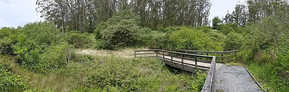 Colma Creek is a small creek that flows to the San Francisco Bay from its source in the Crocker Hills portion of San Bruno Mountain State and County Park, north of San Mateo County's Guadalupe Canyon Parkway,[3] with contribution from April Brook on San Bruno Mountain proper, south of the Parkway.[4] It flows southwest and makes a 90-degree bend in Daly City to flow southeastward, through Daly City, Colma, and South San Francisco to the bay. Its small delta is between South San Francisco and the San Francisco International Airport.[1]