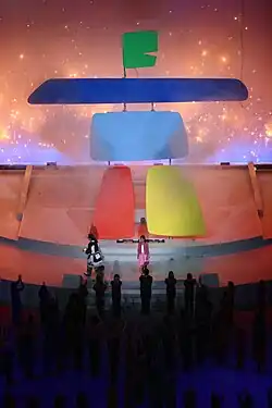 O'Bonsawin describes how amid these tensions the Montreal Olympic Games' closing ceremony employed indigenous symbolism without consultation with local First Nations.[21] Hundreds of performers were enlisted to perform a "tribal" dance that was choreographed by a non-indigenous choreographer, to a musical score ("La Danse Sauvage") created by a non-indigenous composer.[22] Only 200 of the 450 performers were indigenous, with the other 250 being non-indigenous people costumed and painted in "redface"—it was these non-indigenous performers who led the indigenous people into the stadium.[21] O'Bonsawin notes that particularly problematic about this approach to including indigenous "participation" is that it became a model for future Canadian Olympic Games.[22]