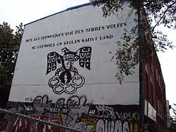 The 2010 Winter Games were met with massive protest locally and internationally. In October 2007, 1500 indigenous delegates at the Intercontinental Indigenous Gathering in Sonora, Mexico passed a resolution stating: "We reject the 2010 Winter Olympics on sacred and stolen territory of Turtle Island – Vancouver, Canada."[60] This launched a global boycott of the 2010 Games with indigenous protests of the 2010 Winter Games rallying under the slogan, "No Olympics on stolen Native land."[61] In an interview with Democracy Now!, commentator and artist Gord Hill explains how the slogan refers to the lack of treaties in British Columbia: "It's illegal, and it's actually immoral, because they were bound by their own laws to make treaties before they settled on any land or any business took place on sovereign indigenous land."[62] The business referred to includes massive real estate developments as explained in a Dominion article:
