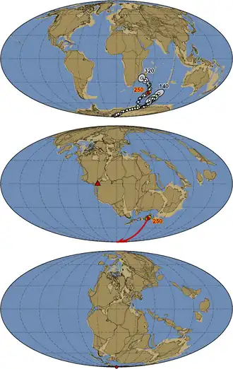 The basin started forming in the Middle to Late Jurassic with the break-up of Pangea and the formation of the Southern Atlantic.[10] The main rifting took place in the Early Cretaceous.[5] The pre-rift sequence of the basin comprises the Pennsylvanian Lolén Formation of the Ventana Group,[11] and the Sauce Grande, Piedra Azul, Bonete and Tunas Formations of the Pillahuincó Group,[2] dating to the Permian.[12] During the late Paleozoic, the Colorado Basin was located in the south polar region, causing a sequence of glacial deposits in the basin. These deposits were mostly sourced from the African basin, the Karoo and Kalahari Basins. The Early Permian sediments are characterized by the presence of diamictites. A transgression in the Permian led to the deposition of the Piedra Azul Formation.[13] The succession contains several hiatuses, dating to the Triassic and Early Jurassic, Albian and Paleogene.[14]