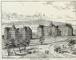 The Colorado State Mental Hospital at Pueblo was Colorado state's largest institution dedicated to caring for the mentally ill until 1962, when the process of regional decentralization resulted in it only serving the Pueblo area.[1] The hospital itself first began operating in the 1880s. The main building of the hospital was opened on November 20, 1883. This early iteration of the Asylum was capable of holding 210 people across 6 wards and was generally equally divided between male and female patients.[2] Asylum leadership consistently had to deal with overcrowding. To combat this, many additions were made to the hospital throughout the late 19th and early 20th centuries. In early 1889 it was reported in the Leadville Daily Times that the hospital had requested a total of $93,436.27 for new constructions on their grounds.[3] These additions did not permanently solve the overcrowding issue, which was addressed through new constructions up until the 1960s. In 1946, the hospital had 4,811 patients enrolled. The majority of the patients came from Colorado's three largest cities, Denver, Pueblo, and Colorado Springs, which made up over half of those receiving care at the hospital and their respective counties totaled 3,183 patients.[4] Patient care and the constant need for new constructions led the hospital towards a difficult financial situation.[5] In 1947, a special legislative committee indicated that they would be selling the Woodcroft portion of the hospital due to its poor condition and financial burden[5]