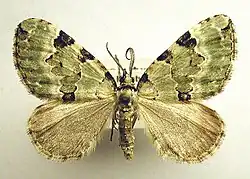 The moth has a wingspan from 22 to 28 millimetres (0.87 to 1.10 in). The strong forewing ground colour is green to bluish green. The wing pattern shows the following colour sequence: a small region at the wing base brown green, the ensuing basal region brighter green, a wide and strongly serrated on the outside discal region dark green edged with white, the postdiscal region whitish green and the marginal region tinted brownish green. There are two distinct blackish spots near the front edge of the wing (costa) and one on the inner edge. In older specimens, the greenish colour can fade. Sometimes newly emerged hatched moths have a whitish, yellowish or pink colour. The hindwings shimmer grey white and have faint lines. The antennae of the males are combed, those of females are simple.[1][2] The larva is stout, gnarled and light grey violet in colour. It has numerous small black spots that each carry a short, stiff brush.