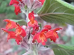Colquhounia coccinea is a species of flowering plant in the mint family Lamiaceae. It is commonly known as scarlet-flowered colquhounia[1] or Himalayan mint shrub.[2] It is native to China, Bhutan, Nepal, Myanmar, India and Thailand.[3] It is an evergreen or semi-evergreen shrub growing to 2.5 m (8.2 ft) tall and broad, with aromatic leaves which are felted underneath (tomentose). Spikes of red or deep orange flowers, with yellow interiors,[2] appear in late summer.[1] Its native habitats include slopes, stony grassy hillsides, thickets, and river valleys.[2]