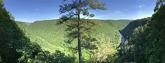 Colton Point State Park continued to attract national attention in the post-war era. The New York Times featured the park and its "breath-taking views of the gorge" as well as its trails and location in the wilds of the state forest in a 1950 article,[35] and in 1966 praised the whitewater boating on Pine Creek and the park's "outstanding look-out points".[26] The Pine Creek Gorge, including Colton Point and Leonard Harrison State Parks and a 12-mile (19 km) section of Tioga State Forest, was named a National Natural Landmark (NNL) in April 1968.[36] A 1973 New York Times article on whitewater canoeing noted the damage along Pine Creek done by Hurricane Agnes the year before.[37] Another Times story in 2002 noted the park for its beauty and wildlife, and cited it as a starting point for hiking the West Rim Trail.[38]