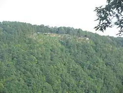The park has five CCC-built picnic shelters: pavilions 1, 3, and 4 are made of stone and timber with stone fireplaces, while pavilions 2 and 5 each has log columns that support a pyramidal roof. The CCC also built six rustic latrines with clapboard siding and gable roofs, and an underground reservoir that is covered with a low hipped roof. Additional structures constructed by the CCC include three overlooks and a rectangular gable-roofed maintenance building with wane edge siding and exposed rafters made of logs. The structures built by the CCC are noteworthy in that they exemplify the rustic style of construction that was prevalent at national and state parks built during the Great Depression. Workers used locally found, natural materials in construction that blended with the natural surroundings.[9][21] Not all of the CCC's work has survived. A concession stand was built by the CCC and sold food and souvenirs from the late 1930s to at least 1953,[27] but was not listed on the 1986 NRHP nomination form. The CCC also built a brick and stone incinerator, but it is in ruins now.[21]