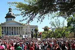 In May 2019, 10,000 people marched at the Statehouse in the "All Out Rally" to protest issues surrounding education, including low teacher pay, high student-to-teacher ratios, and the general underfunding of education. The protest was led by SC for Ed, a left-learning state advocacy group for teachers.[38][39]
