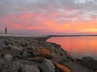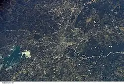 According to the United States Census Bureau, the city has a total area of 140.68 square miles (364.4 km2), of which 137.81 square miles (356.9 km2) is land and 2.87 square miles (7.4 km2) (1.68%) is water.[2] Approximately two-thirds of Columbia's land area, 81.2 square miles (210 km2), is contained within the Fort Jackson Military Installation, much of which consists of uninhabited training grounds. The actual inhabited area for the city is slightly more than 50 square miles (130 km2).[7]