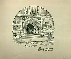 The building's front was made of buff Amherst stone and buff pressed brick. It featured a mosaic of blue freestone and Lake Superior portage stone around its main entrance arch and front gable.[1]