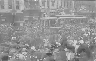 The public primarily sided with the union. The Columbus Chamber of Commerce, anticipating conflict, hosted a mandatory meeting between the union and company in June 1910. On July 23, its hearings concluded, finding that both parties were partly at fault, and that a peaceful resolution should be found. The meeting mostly added to tensions, however, and the strike began the next day at 4 am. The union's chapter had grown to 600 members by this point. They planned to not show up for work, instead selling union buttons around the city and picketing the company's streetcar barns. The streetcar company chose to hire strikebreakers at $30 per week, over double the standard wage of $12.50. They also hired a special policing force, supplied by the local John J. Mahoney Detective Agency, to protect the streetcars and facilities. The strike ended up more serious, as crowds barricaded streetcar tracks and threw bricks and rocks into the streetcars. The company police responded with gunfire. That night, 76 people were arrested, though riots continued on the following day. Mayor George Sidney Marshall called in about 5,000 members of the Ohio National Guard. The troops kept order in the city until their departure on August 7. More rioting then took place, with shootings, barricades, stonings, and streetcars blown up with dynamite. It led to the National Guard returning, and the union and public moreso aiming for a peaceful end to the riots. Still about 3,000 to 4,000 strikers, sympathizers, or disrupters continued to riot. It led to a bad public image of the city, hurting business activity, and worrying the city planning for a state fair in September. On October 18, the union admitted defeat, and its 570 striking workers either returned to work or moved to work elsewhere in Columbus, or for Cleveland streetcar companies.[5]