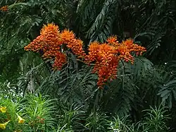 Colvillea racemosa is known by the common name Colville's glory.[4] The tree is particularly known for its bright orange flowers that grow in large cone or cylinder shaped clusters. After flowering, the tree produces long, flat, woody seed pods. The tree has small deep green leaves, superficially similar to Delonix regia.