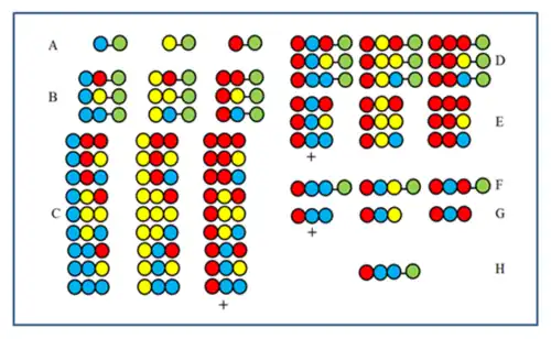 Positional scanning was introduced independently by Furka et al.[34] and Pinilla et al.[35] The method is based on the synthesis and testing of series of sublibraries. in which a certain sequence position is occupied by the same amino acid. The figure shows the nine sublibraries (B1-D3) of a full peptide trimer library (A) made from three amino acids. In sublibraries there is a position which is occupied by the same amino acid in all components. In the synthesis of a sublibrary the support is not divided and only one amino acid is coupled to the whole sample. As a result, one position is really occupied by the same amino acid in all components. For example, in the B2 sublibrary position 2 is occupied by the "yellow" amino acid in all the nine components. If in a screening test this sublibrary gives positive answer it means that position 2 in the active peptide is also occupied by the "yellow" amino acid. The amino acid sequence can be determined by testing all the nine (or sometime less) sublibraries.