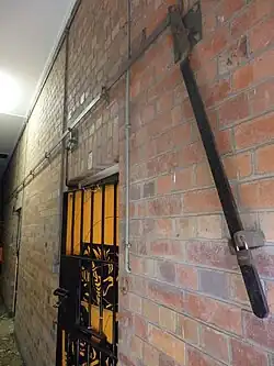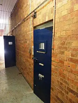 Metal grill doors secure the entrance to the building and each of the cells and retain original hardware including a locking device (lever) at the eastern entrance that connects to all the cell door locks.[1]