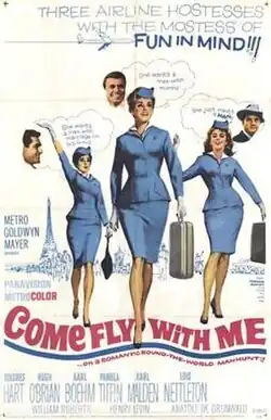 Come Fly with Me is a 1963 British Jet Age romantic comedy film directed by Henry Levin and released by MGM. Featuring an ensemble cast of Dolores Hart, Hugh O'Brian, Karlheinz Böhm, Pamela Tiffin, Karl Malden, and Lois Nettleton, it is based on Bernard Glemser's 1960 chick-lit novel Girl on a Wing,[1] which was published again in 1969 under the title The Fly Girls. It follows three young international air hostesses looking for romance and excitement, weaving abundant soap opera elements into its tale of opportunity for glamorous travel and adventures with men that came with being an airline hostess.