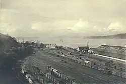 In 1873 the Northern Pacific Railway, the first transcontinental railroad in the northern United States, announced it would locate its terminus at Commencement Bay. When the railroad reached the bay in 1883 it caused a boom of development in Tacoma. The railroad facilities were located near the extensive tide flats by the mouth of the Puyallup River, about a mile from the original site of Tacoma. Not only did the tide flats provide level ground compared to the steep slopes surrounding the rest of the bay, but dredging work would quickly provide deep water access to the railyards and warehouses. A new town, called New Tacoma, quickly grew up by the railroad hub. "Old town" Tacoma and New Tacoma soon merged. Large land grants were provided to the Northern Pacific, including a significant part of the coast of Commencement Bay. Over time the city of Tacoma bought up this land.[3]