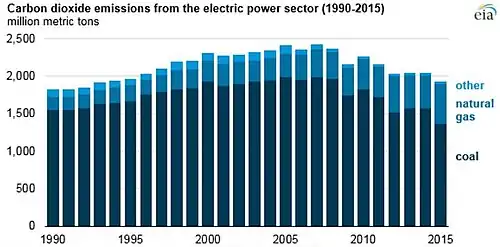 In 2021, the electric power sector was the second largest source of U.S. greenhouse gas emissions, accounting for 25% of the U.S. total.[15] These greenhouse gas emissions are contributing to climate change in the United States, as well as worldwide.