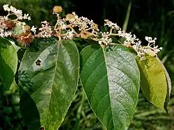 Commersonia bartramia is a shrub or tree that typically grows to a height of up to 25 m (82 ft), the trunk up to 50 cm (20 in) in diameter and sometimes forming buttress roots. The leaves are heart-shaped to egg-shaped or broadly egg-shaped, 50–140 mm (2.0–5.5 in) long and 10–20 mm (0.39–0.79 in) wide on a densely hairy petiole 10–30 mm (0.39–1.18 in) long with stipules 2–6 mm (0.079–0.236 in) long at the base. The tip of the leaf tapers to a fine point, there are sometimes fine, irregular teeth on the lower surface, and the lower surface is much paler than the upper surface. The flowers are arranged in dense heads of 20 to 100 or more 30–100 mm (1.2–3.9 in) long, the groups on a peduncle 5–25 mm (0.20–0.98 in) long, each flower on pedicel 2–7 mm (0.079–0.276 in) long. The sepal are joined at the base with 5 white lobes 1–3 mm (0.039–0.118 in) long, and five white petals with ligules as long as the sepal lobes, and there is a single staminodes between each pair of stamens. Flowering occurs from October to March and the fruit is a hairy, dark capsule 15–25 mm (0.59–0.98 in) long.[2][3]
